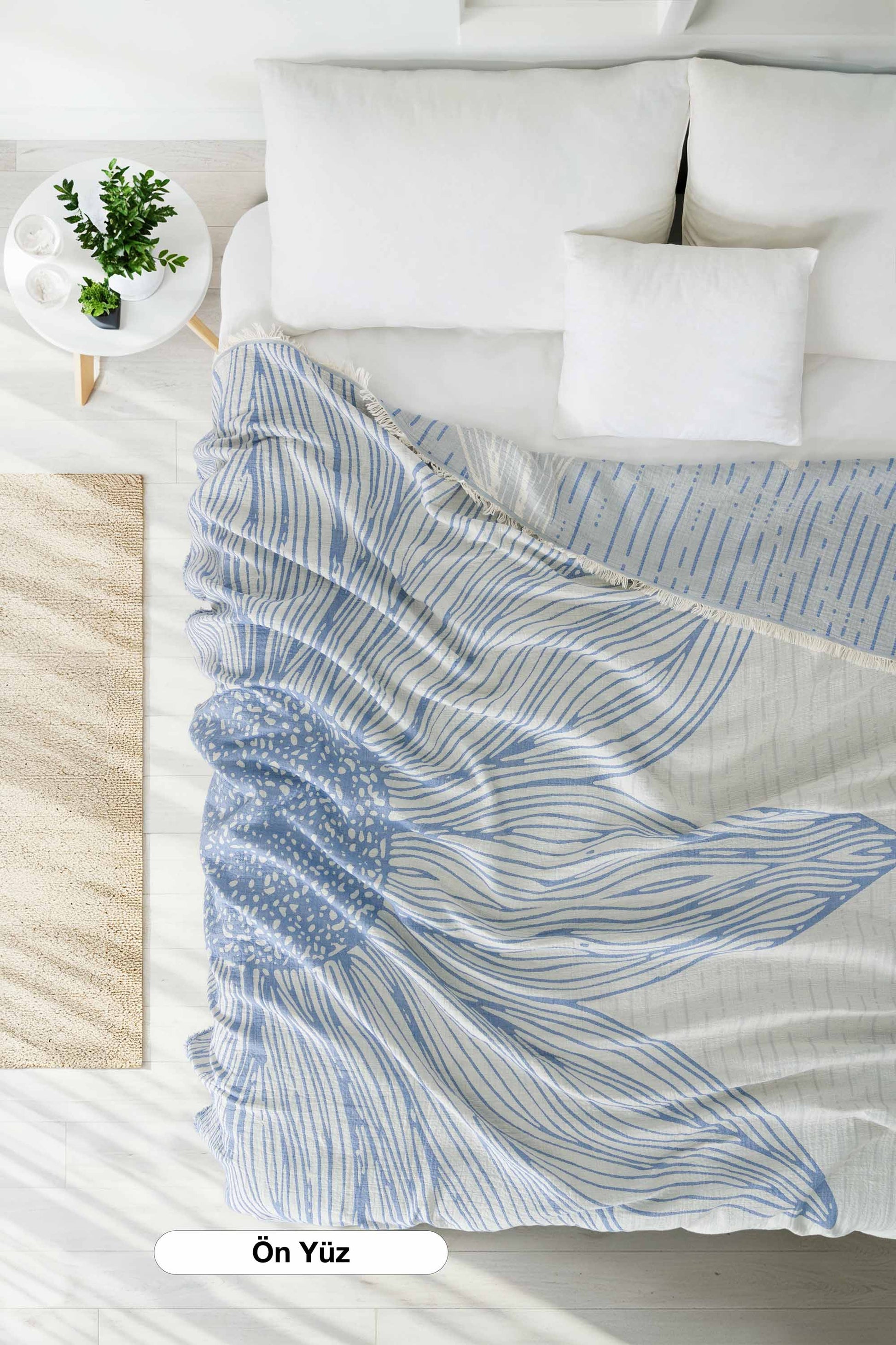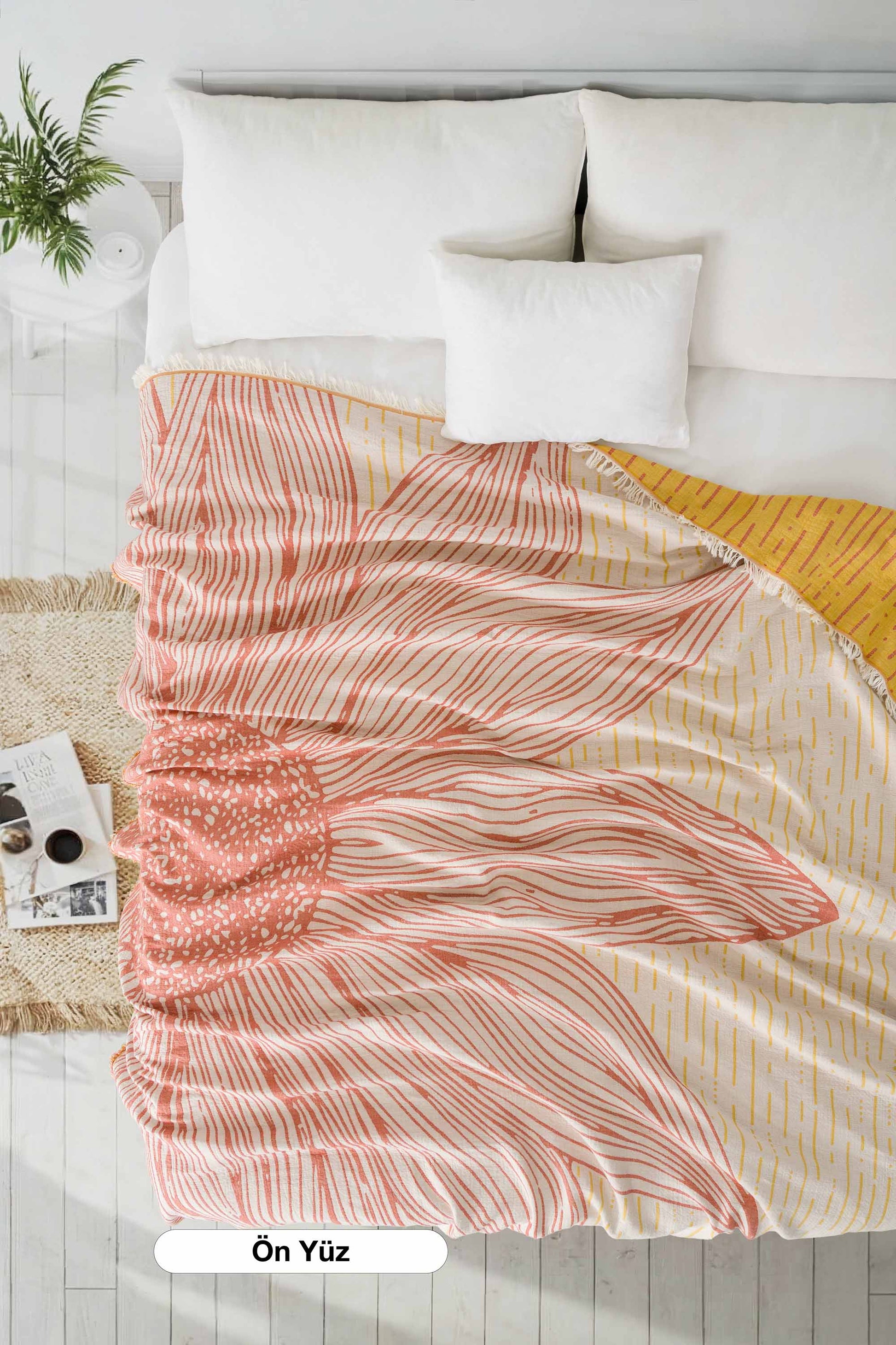Bring the joy of nature to your bedroom with the Sunflower Jumbo Jacquard panel patterned muslin blanket, which stands out with its elegant design and perfect texture. Made from 100% cotton muslin fabric, this special product is both lightweight and durable thanks to its four-layer jacquard weave. It features a woven pattern, not a print.