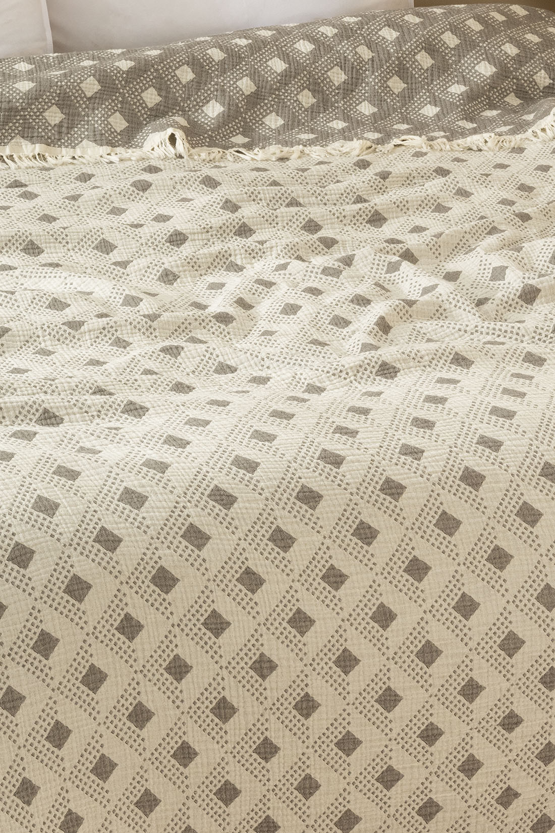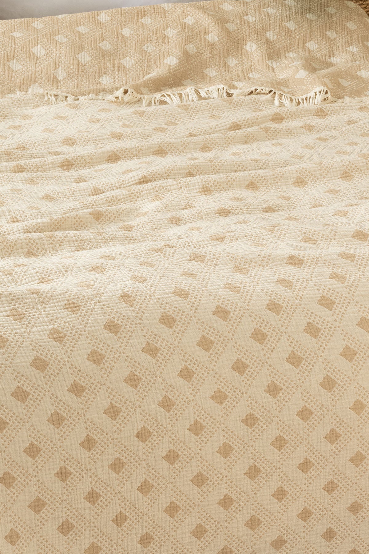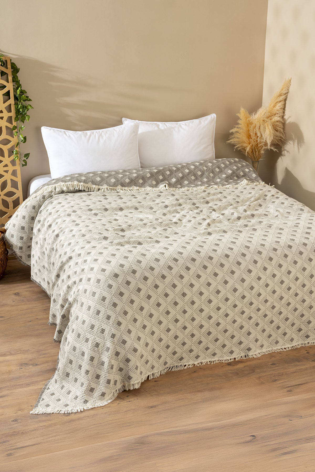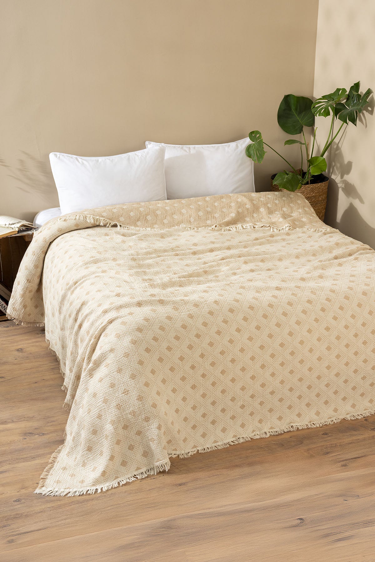 %100 pamuk iplikten üretilen 4 katlı müslin dokuması, hafif ama tok bir kullanım sunar. Nefes alabilen yapısı sayesinde dört mevsim boyunca pike veya yatak örtüsü olarak rahatlıkla kullanılabilir. Dört kenarındaki saçak detayları, ürüne doğal ve sıcak bir karakter kazandırır. Çift taraflı kullanılabilir yapısıyla tek ürünle iki farklı görünüm elde edebilirsiniz.