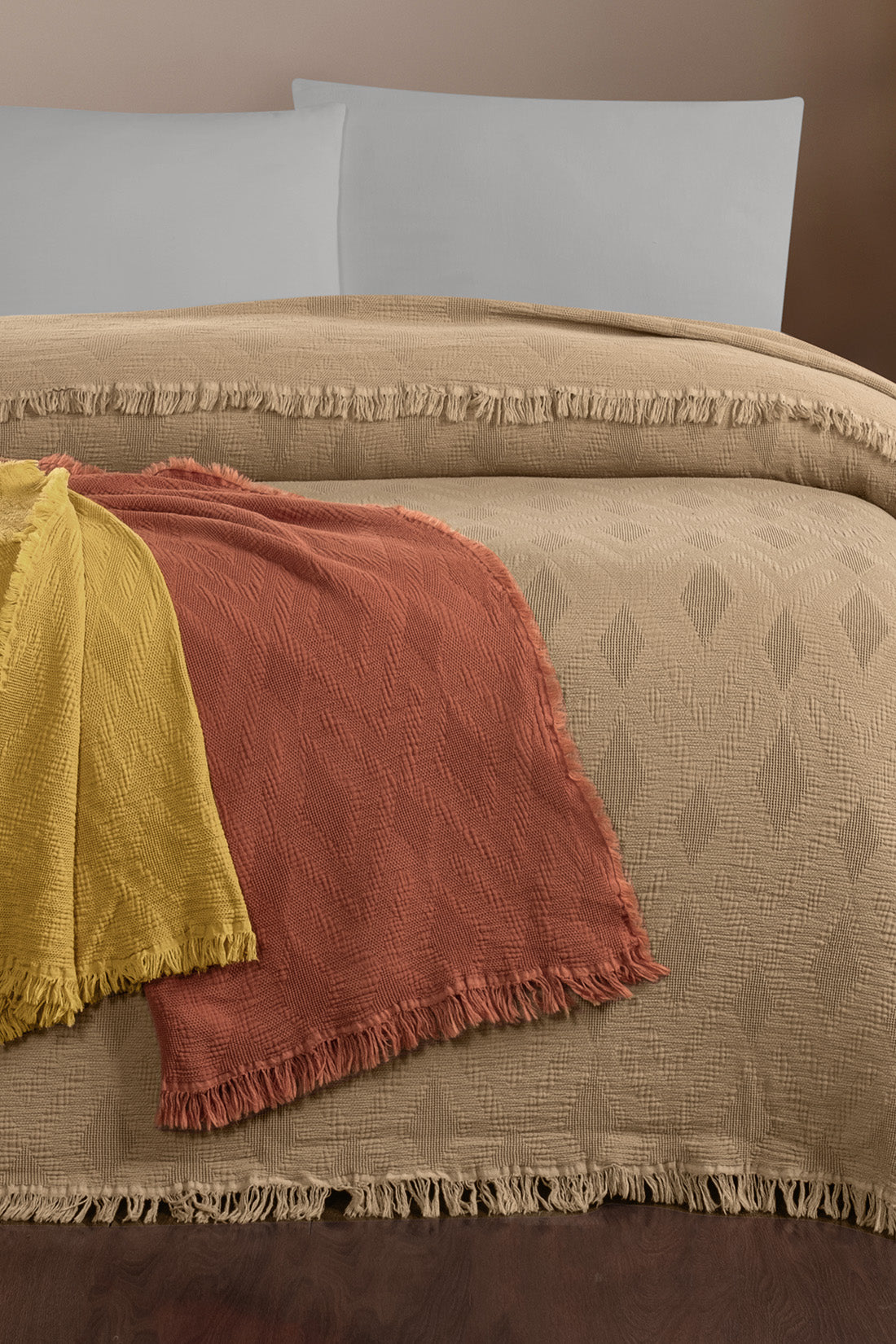 Trio, ritmik jakarlı desen yapısı ve waffle müslin dokusuyla yatak odanıza dengeli ve sıcak bir görünüm kazandırır. Parça boyama tekniğiyle elde edilen doğal renkleri, dokulu yüzeyle birleşerek sade ama karakterli bir estetik sunar. %100 pamuk yapısı sayesinde hafif, nefes alabilen ve konforlu bir kullanım sağlar. Pike ve yatak örtüsü olarak dört mevsim kullanıma uygundur. Ön yıkama yapılmıştır, çekme yapmaz.